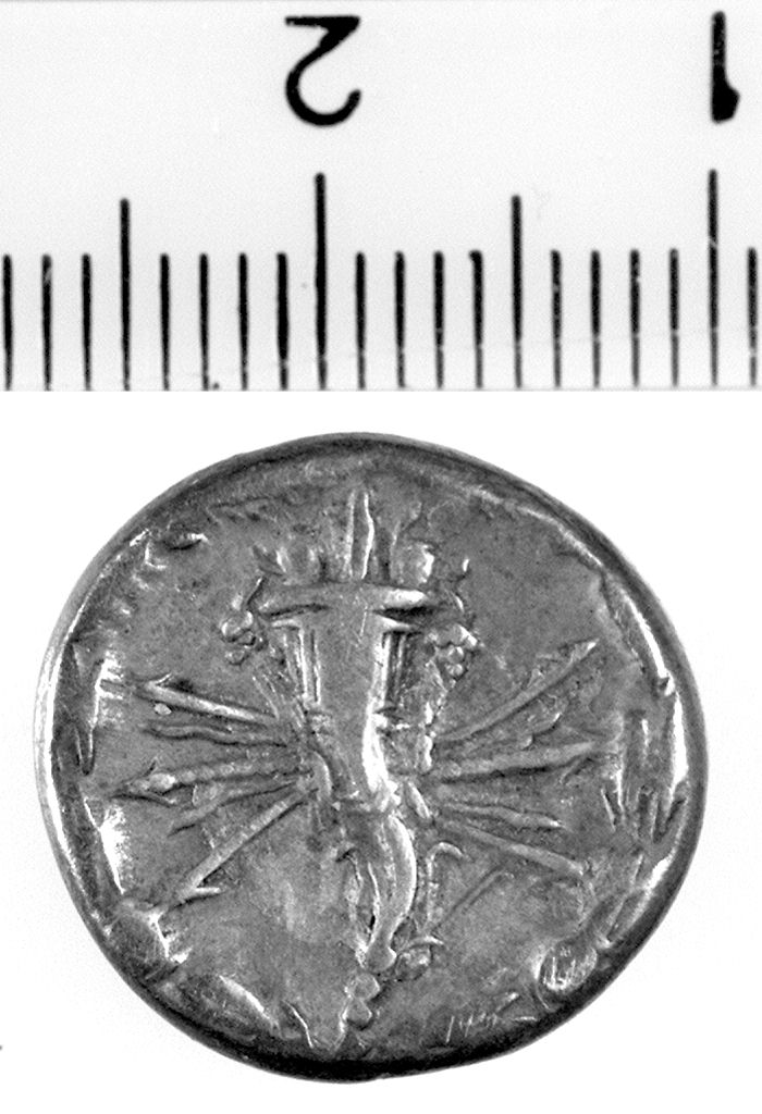 D/ Testa di Roma a d. con elmo alato; davanti X. R/ Cornucopia traversatada un fascio di fulmini, entro una corona di spighe e papaveri