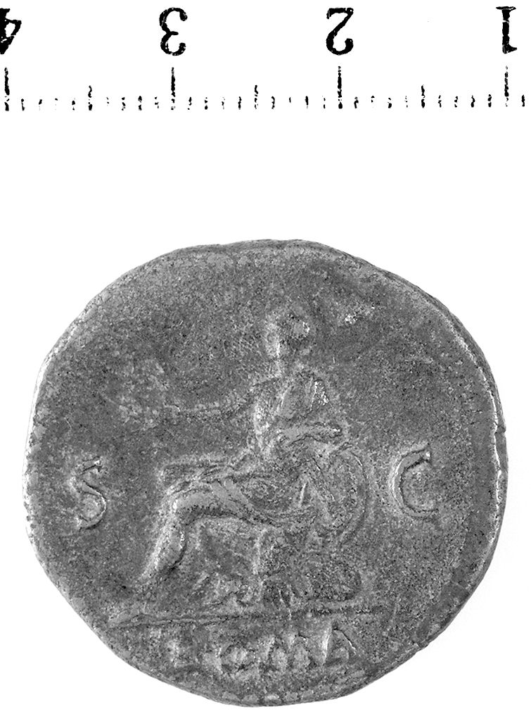 D/ Testa radiata di Nerone a s. R/ Roma galeata seduta a s. su corazza. col piede posato su un elmo, tiene il parazonio ed una corona; dietro, scudo