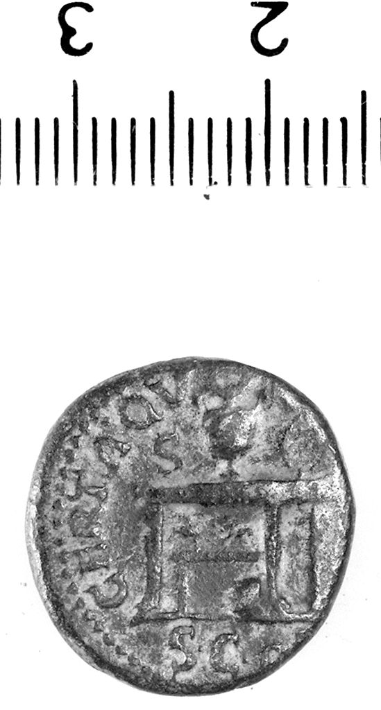 D/ Testa laureata di Nerone a d. R/ Tavola adorna di bassorilievi, con sopra il segno di valore; urna e corona, sotto scudo rotondo