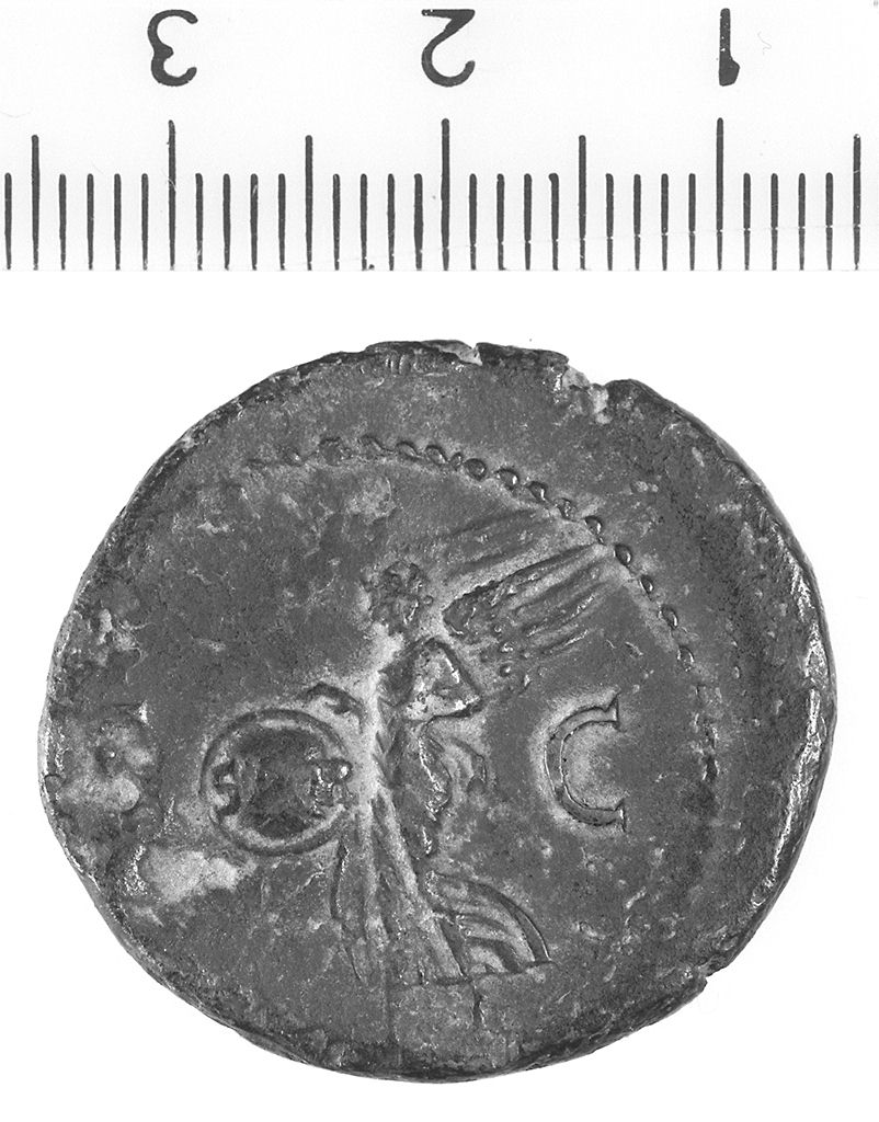 D/ Testa laureata di Nerone a d. R/ Vittoria alata gradiente a s. che tiene uno scudo iscritto