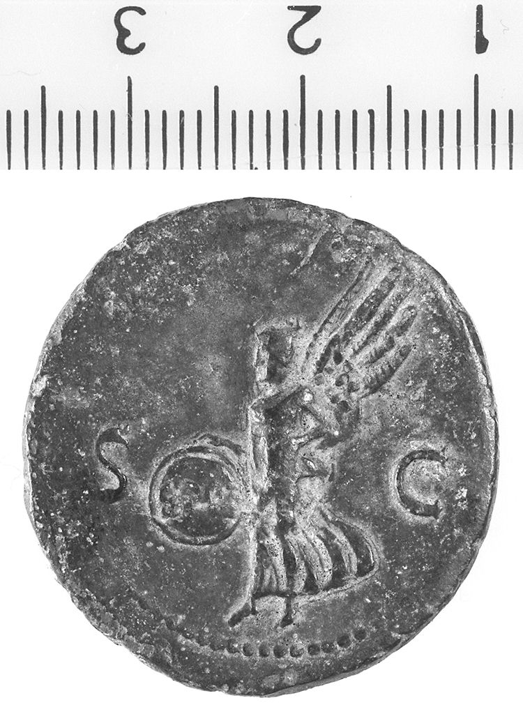 D/ Testa laureata di Nerone a d. R/ Vittoria alata gradiente a s. che tiene uno scudo iscritto