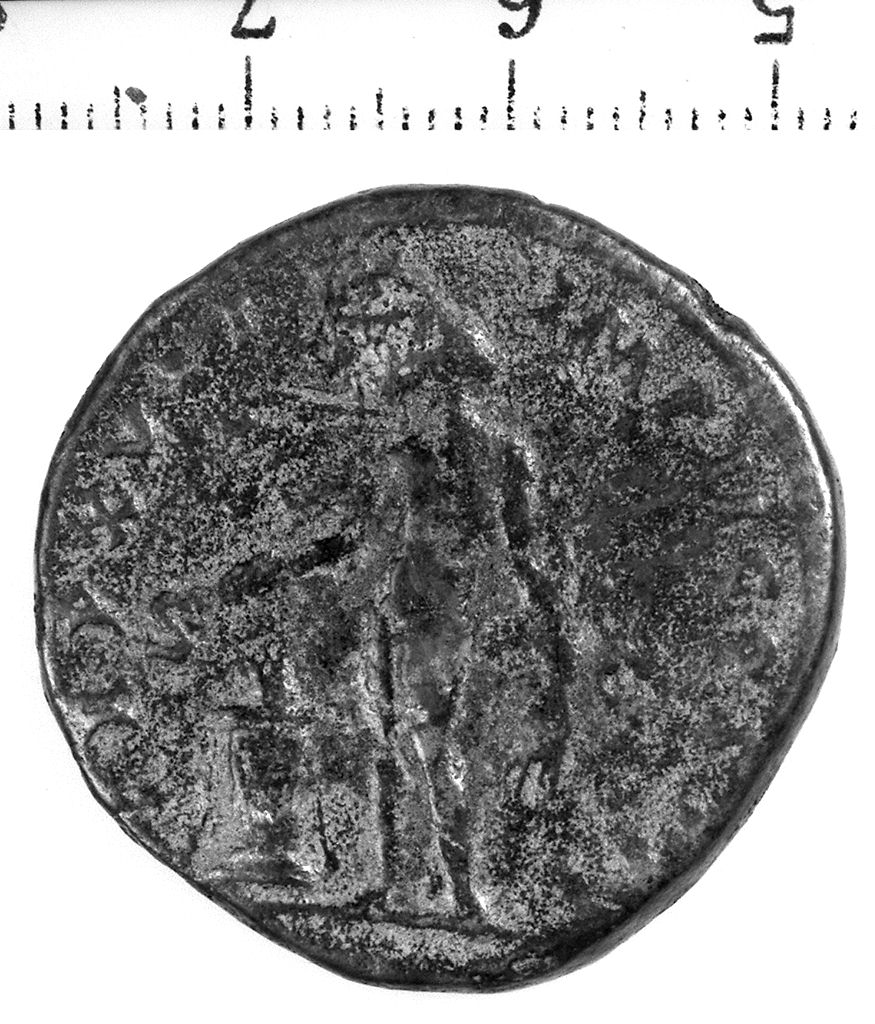 D/ Busto drappeggiato di M. Aurelio, volto a d. R/ Genio nudo stante di fronte e volto a s., tiene nella mano d. una patera al di sopra di un altare e nella s. spighe di grano