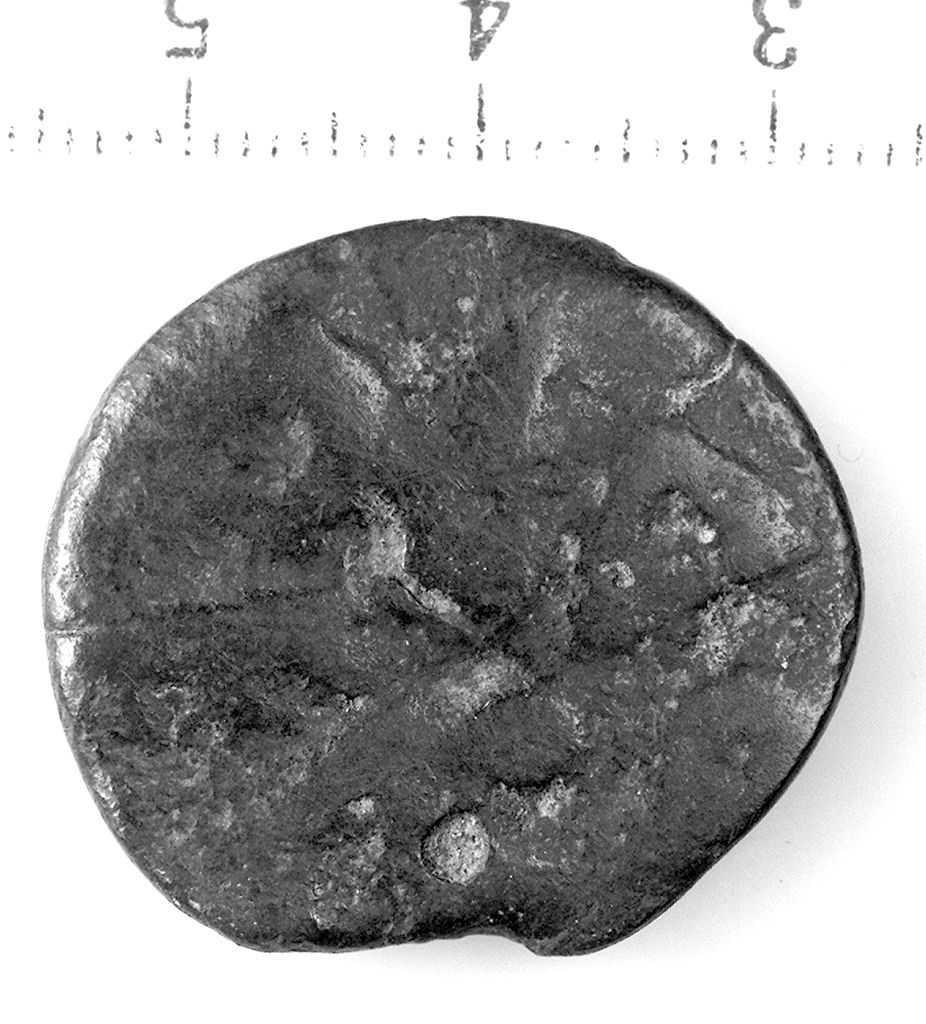 D/ Testa giovanile bifronte, imberbe, con copricapo a punta.. R/ Al centro 2 punti in rilievo