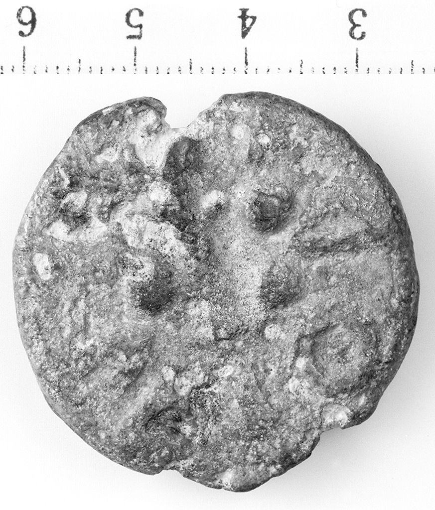 D/ Testa giovanile bifronte, imberbe con copricapo appuntito. R/ Clava alcentro, 3 punti in rilievo
