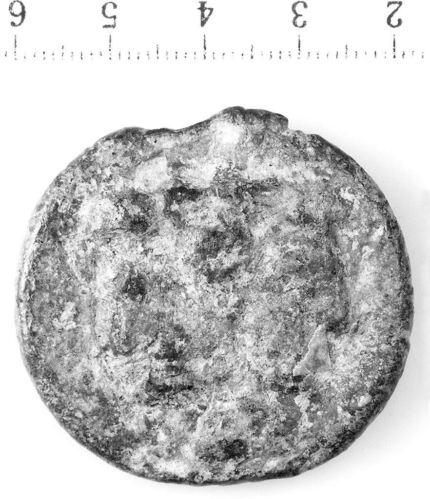 D/ Testa giovanile bifronte, imberbe con copricapo appuntito. R/ Clava alcentro, 4 punti in rilievo