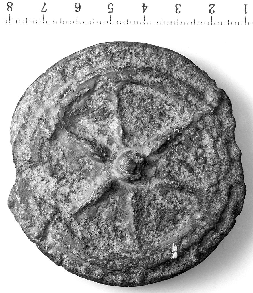 D/ Ruota a sei raggi e doppio anello in rilievo. R/ Ruota a sei raggi e doppio anello in rilievo