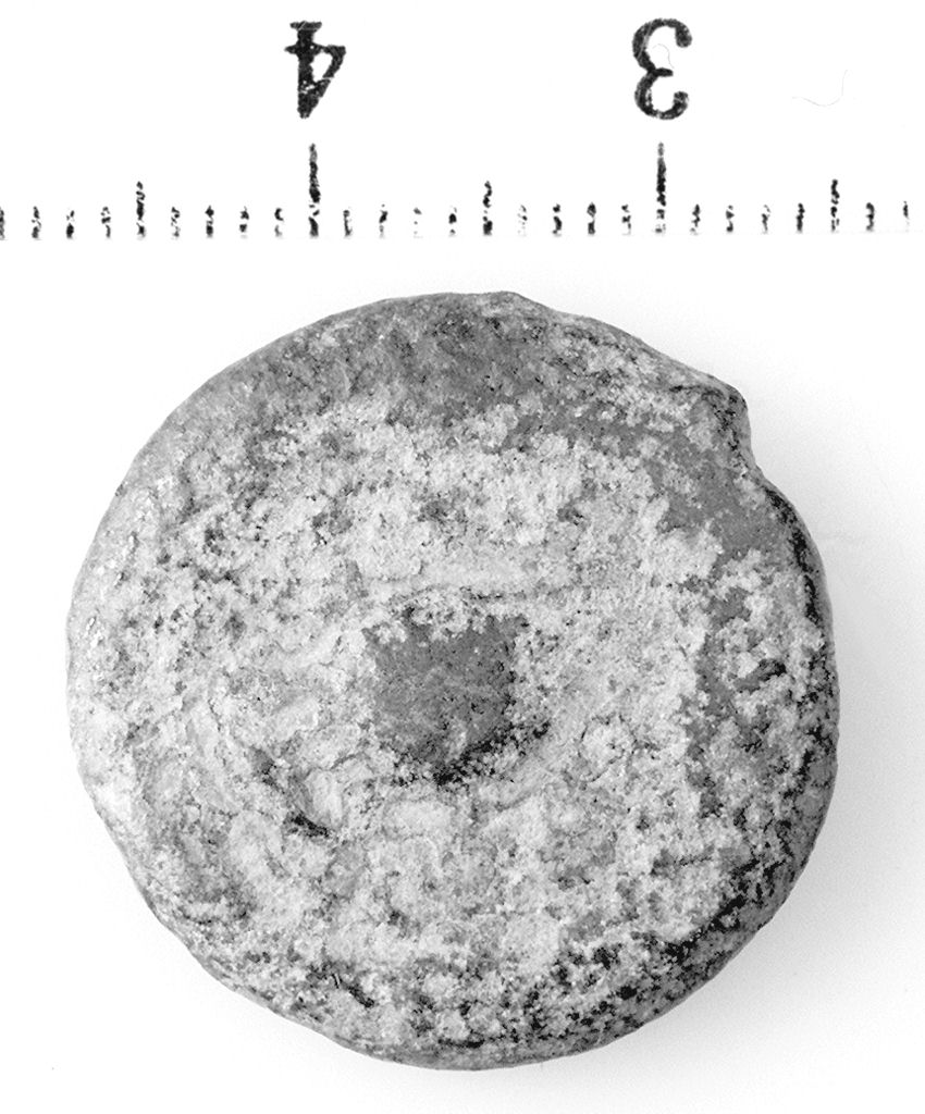 D/ Ruota a quattro raggi e anello in rilievo. R/ Anfora da trasporto e anello in rilievo