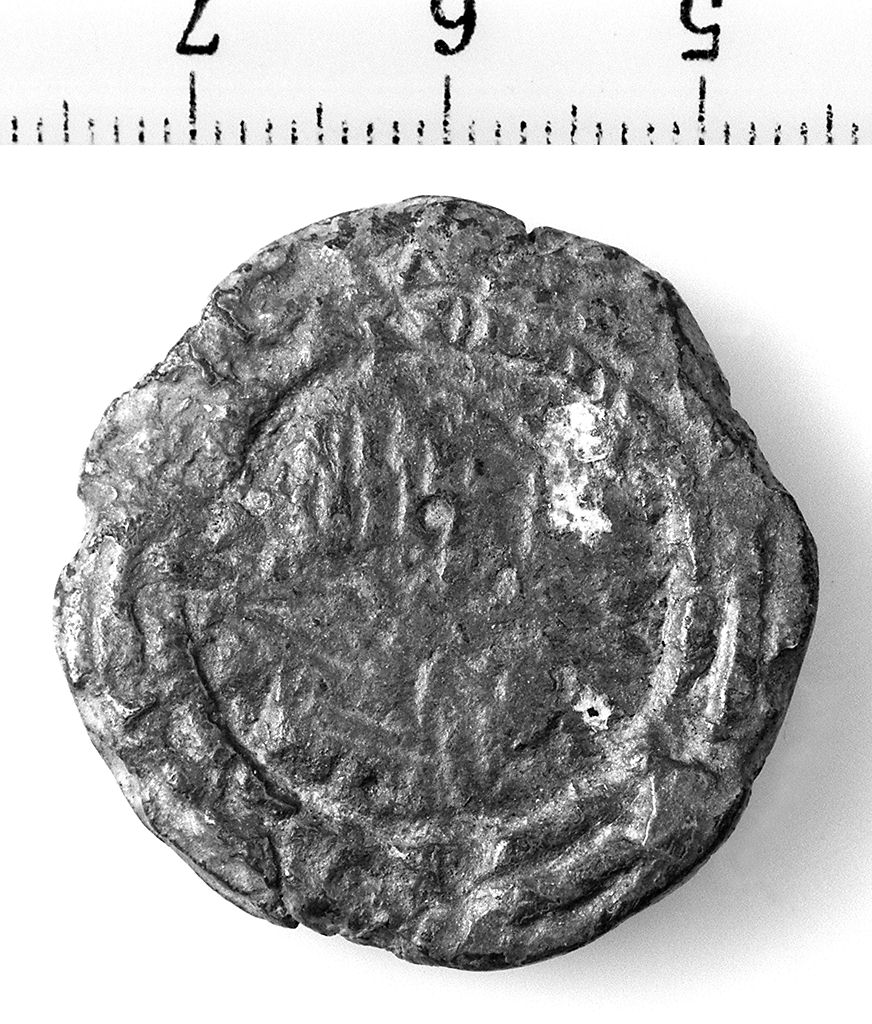 D/ Ruota arcaica, doppio anello in rilievo. R/ Tracce di tre crescenti; doppio anello in rilievo