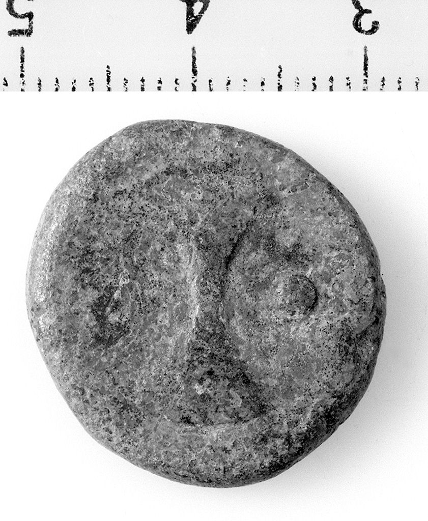 D/ Ruota a sei raggi; globetto in rilievo. R/ Bipenne non immanicata; globetto in rilievo, lettera alfabetica