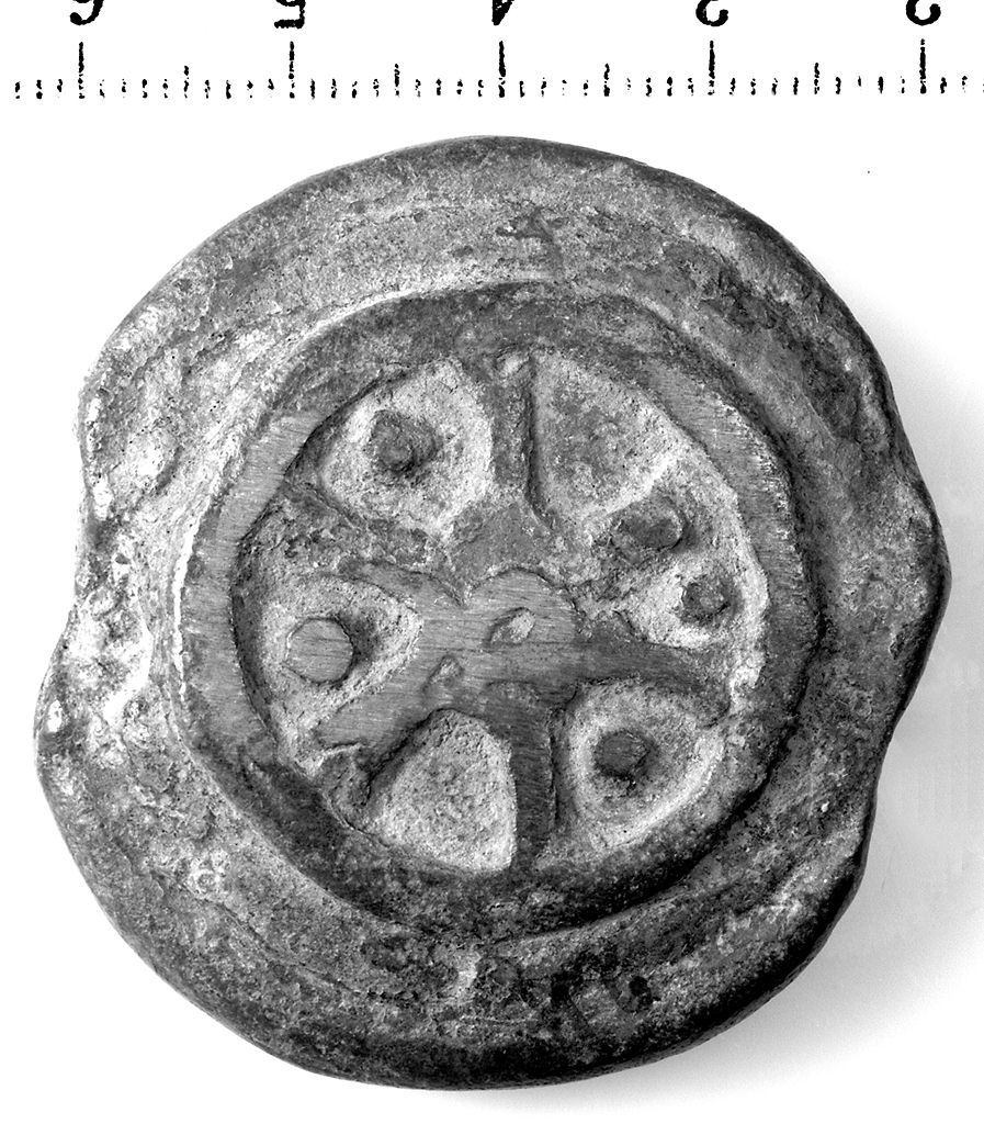 D/ Cavallo al galoppo a d.; 4 globetti in rilievo.d.. R/ Ruota a 6 raggi;4 globetti in rilievo
