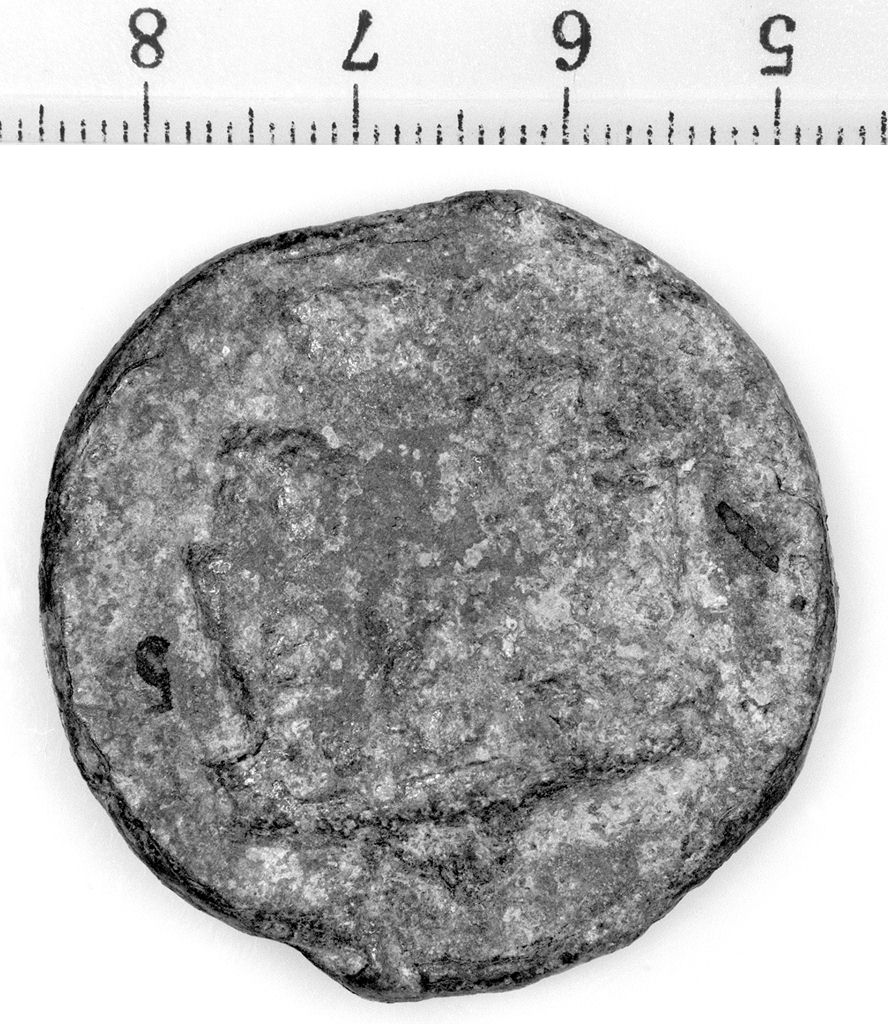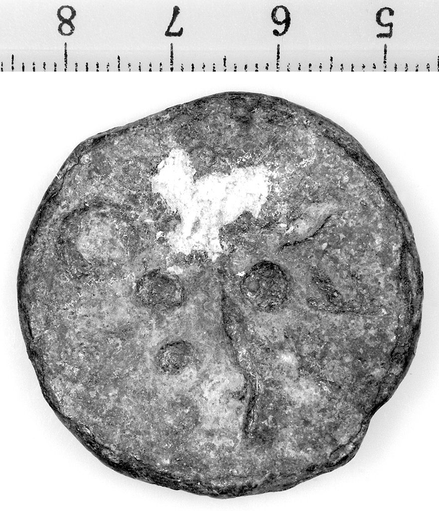 D/ Testa giovanile bifronte, imberbe con copricapo a punta. R/ Al centro clava e 3 punti in rilievo