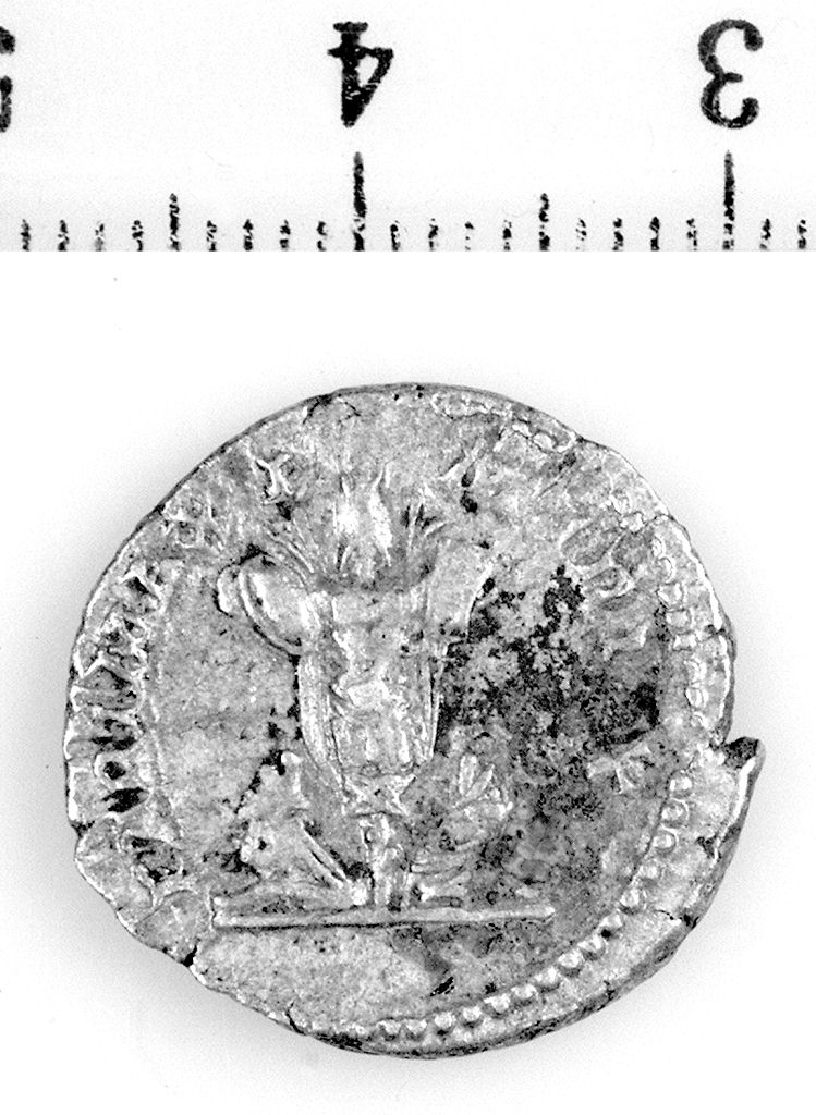 D/ Testa di Settimio Severo, laureato e volto a d.. R/ Trofeo d'armi con due guerrieri seduti ai lati