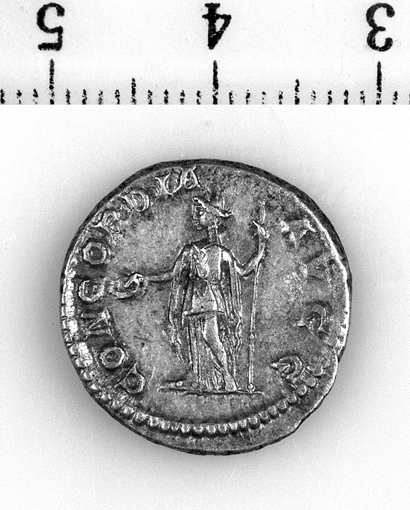 D/ Busto drappeggiato di Plautilla con capelli pettinati ad onde orizzontali, volta a d.. R/ La Concordia stante e volta a s. con patera e scettro