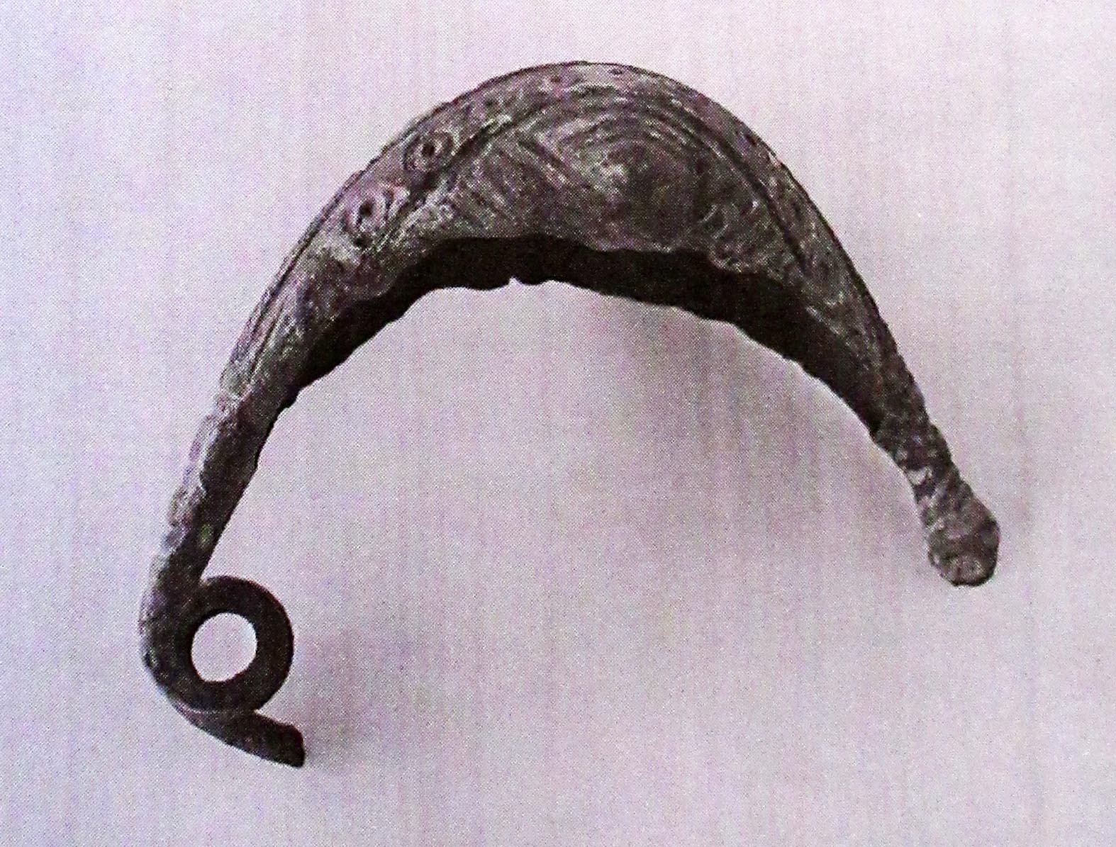 Fibula in bronzo a navicella con arco a losanga espansa provvista di apofisi laterali, molla a tre giri unilaterale. Decorazione incisa