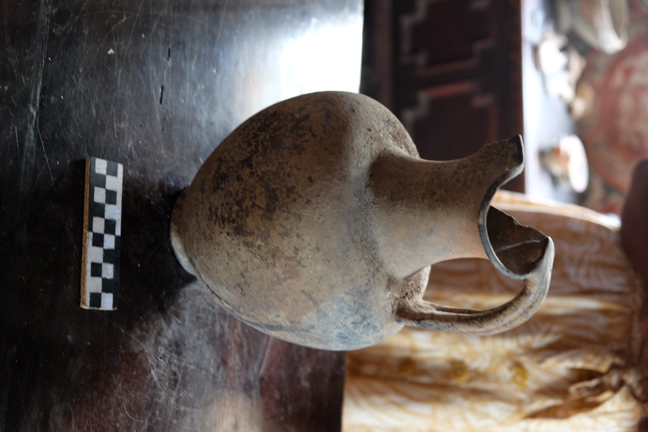 Oinochoe a bocca trilobata con collo troncoconico, ansa verticale costolata, spalla espansa, ventre rastremato e basso piede ad anello, in impasto bruno nerastro. Mancante di parte dell'orlo e del piede
