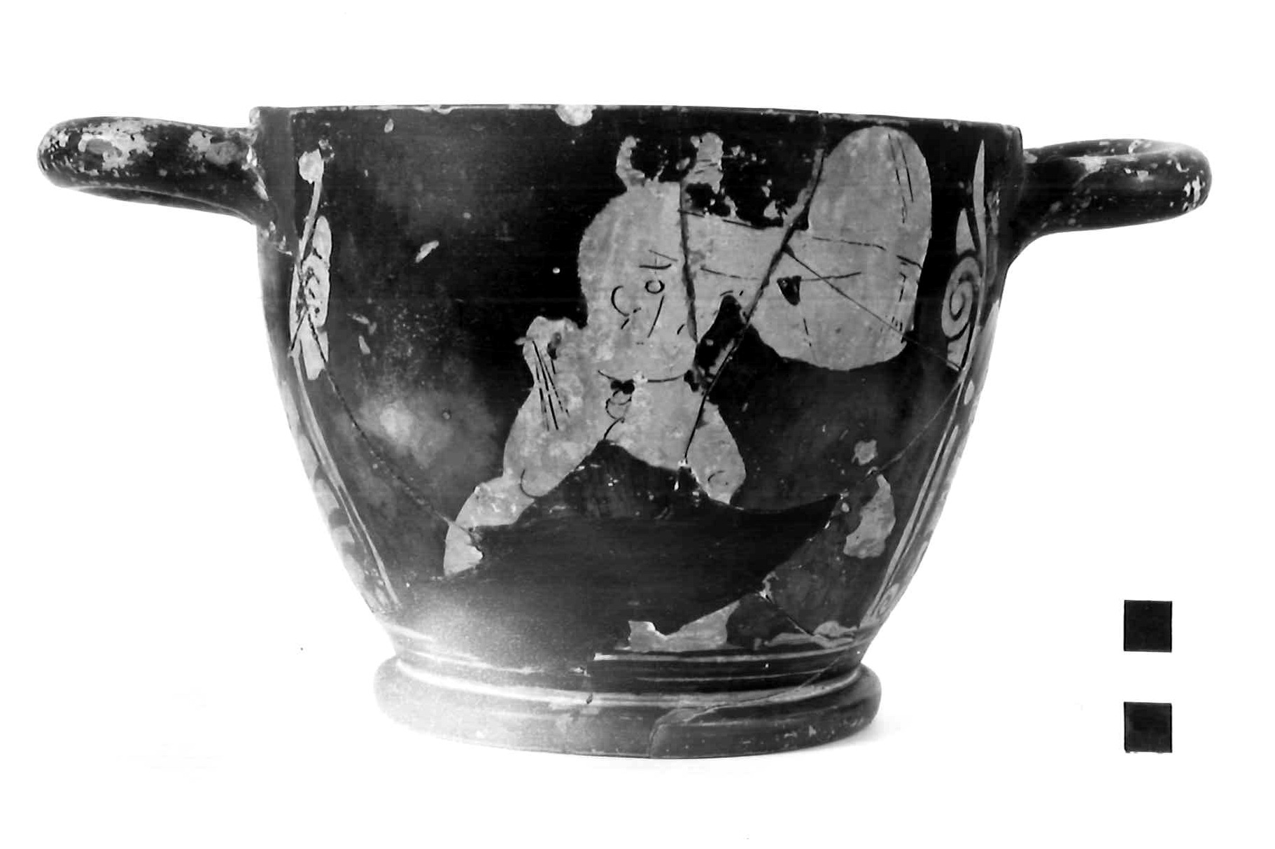 Ampia bocca con orlo indistinto, arrotondato; vasca troncoconica a profilo convesso; anse orizzontali a bastoncello, lievemente oblique, impostate poco sotto l' orlo; basso piede ad anello. Vernice in parte rubefatta per eccesso di cottura