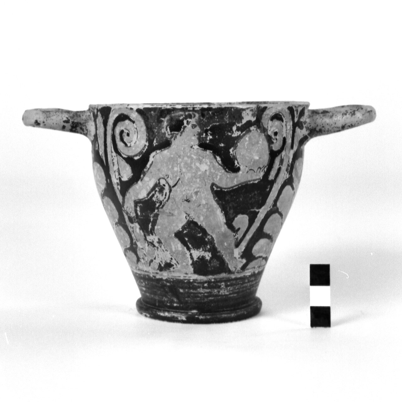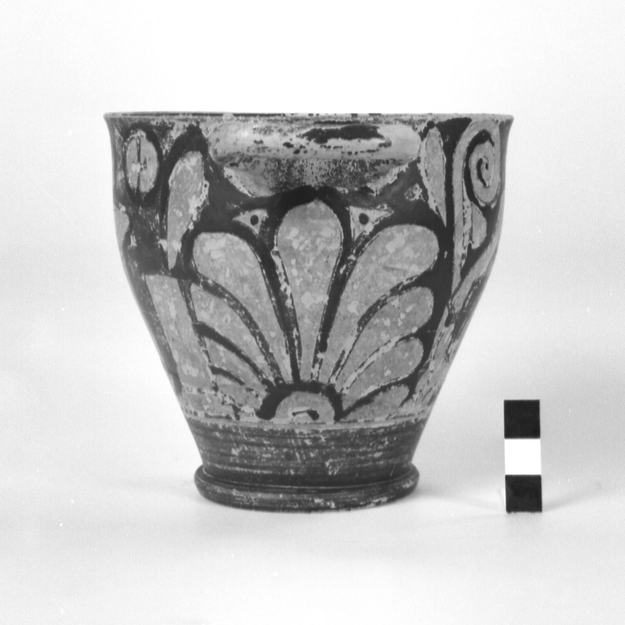 Ampia bocca con orlo indistinto, arrotondato; vasca troncoconica a profilo convesso; anse orizzontali a bastoncello, lievemente oblique, impostate poco sotto l' orlo; basso piede ad anello