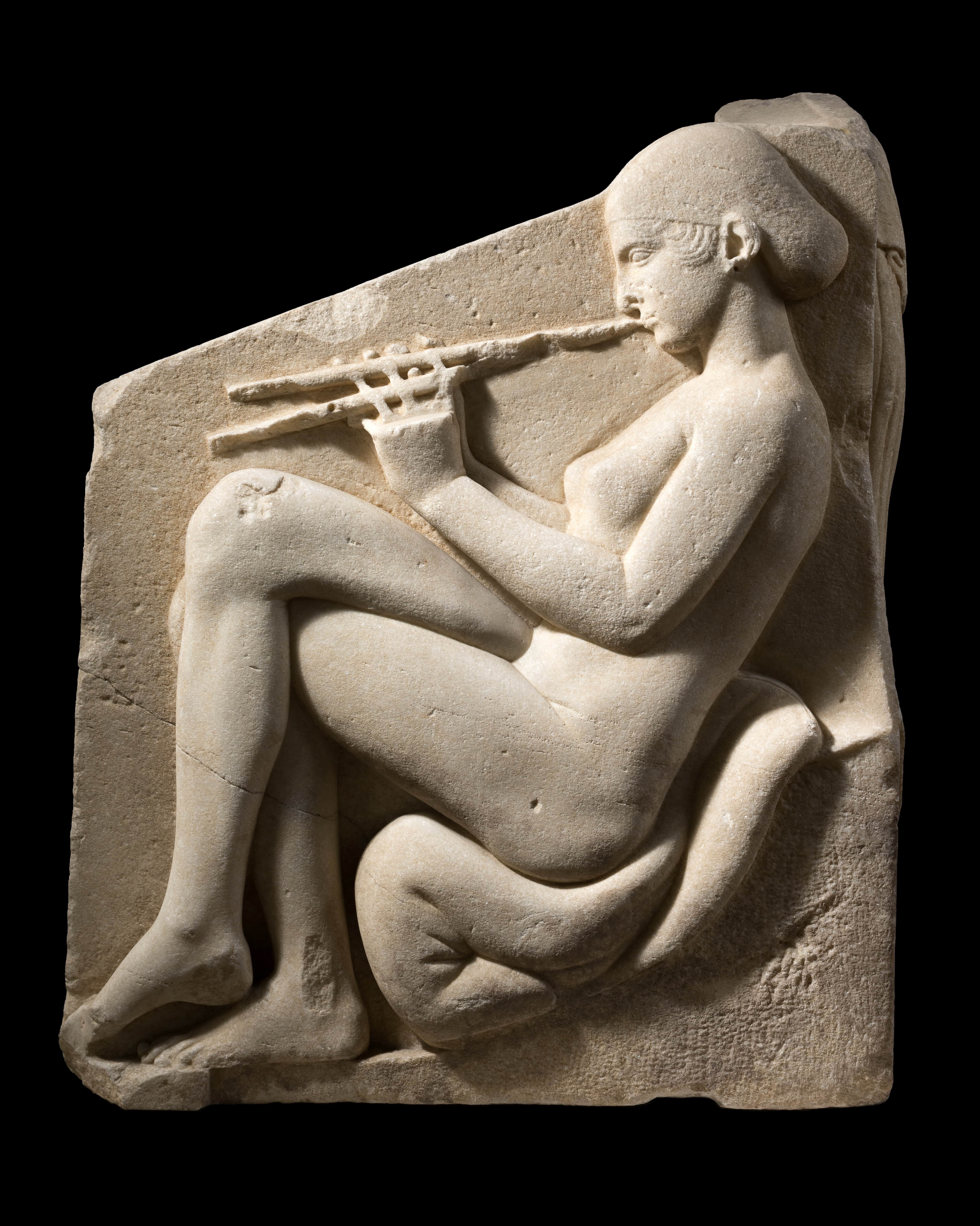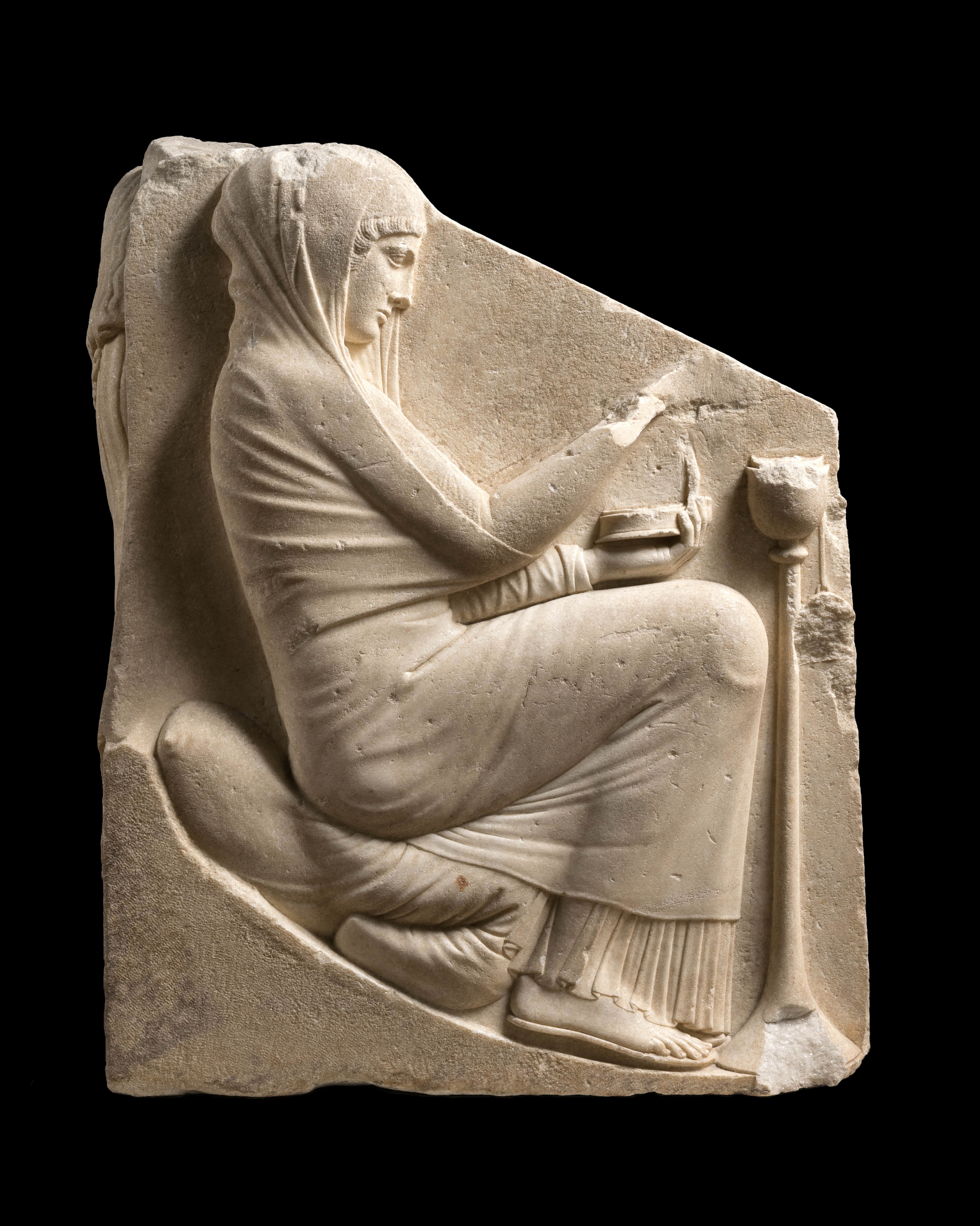 Il monumento ha subito notevoli trasformazioni rispetto alla sua forma originaria: la brutale frattura nella parte superiore della fronte e il taglio a spiovente sui lati brevi, l'eliminazione delle decorazioni angolari, in basso. A causa di queste rilavorazioni, manca anche la parte inferiore del cuscino ripiegato su cui siede la flautista, sul lato destro. Le mani di entrambe le figure sui lati brevi sono gravemente danneggiate, probabilmente a causa del trasporto del monumento in età antica. Sulla fronte al centro c’è una figura femminile frontale, visibile dalla vita in sù mentre la parte inferiore è nascosta da un velo, tenuto da due figure femminili, in piedi sui lati. Essa si sostiene con le braccia alle spalle delle sue aiutanti, mentre il viso è rivolto di profilo, in alto verso la sua destra. I capelli tenuti da una sottile fascia sono lunghi e scendono dietro le spalle, due fini ciocche scendono davanti sul seno destro. L'orecchio è quasi completamente nascosto dai capelli. Veste un leggero chitone ionico, che mette in evidenza le forme del corpo; i seni sono molto distanziati fra di loro. La figura laterale di destra indossa un peplo e quella di sinistra un chitone. Entrambi sono acefale, ma della figura di destra si conserva una vaga traccia del monto della bocca e del naso lungo la frattura. Le aiutanti rispettivamente con il braccio destro e sinistro, sostengono il velo che nasconde in patte la figura centrale. Sullo sfondo le braccia si incrociano dietro le spalle della padrona e la sostengono sotto le ascelle; la loro lunghezza innaturale è stata giustamente osservata da M. Robertson (A History of Greek Art, Cambridge 1975, p. 204). Le due figure si piegano verso di lei e presentano le gambe interne più arretrate rispetto a quelle in primo piano. Anche qui si nota un’imperfezione: il piede sinistro della figura col peplo si sovrappone con l'alluce al lembo della veste che scende in primo piano. Il terreno su cui poggiano le figure è sassoso. Sul lato breve di sinistra è una giovane flautista nuda, seduta su un cuscino ripiegato con le gambe accavallate, di profilo verso sinistra. I capelli sono completamente raccolti e nascosti da un "sakkos”. Le dita delle mani sono molto danneggiate. Sul lato breve di destra una figura femminile vestita di chitone e himation che le copre anche la testa è seduta su un cuscino ripiegato, di profilo verso destra. Tiene con la mano sinistra una scatola rotonda da cui probabilmente prendeva grani d'incenso da gettare nel “thimiaterion" che le sta di fronte. La mano destra manca completamente. I piede sono calzati da sandali. Subito dopo il ritrovamento si ritenne che questo pezzo fosse un trono, da qui la denominazione che gli è rimasta (E. Petersen, R.M. 7,1892, pp. 32 e ss.) Successivamente è stato interpretato come coronamento di un altare (H. von Gerkan, Oe.J., 25, 1929, pp. 14 e ss.; M. Robertson op. cit. in bibl.), oppure di un'edicola (Rodenwaldt, A. A., 1946-47, pp. 40 e ss), sicuramente non è una struttura portante dato l'esiguo spessore delle pareti (Helbig III4, 2340, H. von Steuben). Anche E. Simon pensa ad un elemento di coronamento, in particolare ad un acroterio (Die Geburt von Aphrodite, Berlino 1959). S. Ferri interpretando il pezzo come un rilievo sepolcrale, immagina che fosse collocato a coronamento di un edificio funerario, la cui entrata doveva corrispondere al listello al di sotto del velo (Una possibile soluzione per il trono Ludovisi, Opuscula, 1962, pp. 405-408). L'interpretazione della scena è molto discussa. Esistono pochi dubbi sul fatto che le due figure sui lati corti presentino un voluto contrasto. La flautista, come sappiamo dalla letteratura e dalla pittura vascolare era un'etera e si pone in netta contrapposizione con la pudica figura dell'altro lato, interpretata come una sposa, simbolo dell'amore sacro. Questa interpretazione si unisce molto bene con l'ipotesi che la rappresentazione sulla fronte sia una nascita di Afrodite sorgente dalle acque (1). Un certo credito ha anche l'interpretazione della scena come un ritorno di Persephone, se il rilievo, come da molti è ritenuto proviene dalla Magna Grecia, dove il culto della dea era molto diffuso. In questo caso le figure sui lati brevi potrebbero illustrare una scena di culto (R. Bianchi Bandinelli; E. Paribeni, L'arte dell'antichità classica, Torino 1976, n. 439). Le figure laterali si spiegano meno bene nel caso che la scena centrale sia intesa come bagno rituale (2). Mentre più plausibili sono gli argomenti sostenuti per la rappresentazione di una scena di parto, ed in questo caso le figure dei lati brevi si spiegherebbero come per l'interpretazione della nascita di Afrodite (3). Il ritrovamento in prossimità del luogo: "extra Portam Collinam”, in cui secondo la tradizione sorgeva il santuario di Venere Ericina, confermerebbe l'ipotesi della nascita di Afrodite (J. Colin R. A., XXV, 1946, p. 23, 138 e ss.; E. Simon, op. cit. in bibl.). Dal confronto con alcuni pinakes votivi di Locri, che presentano affinità stilistiche col nostro pezzo, si ritiene che esso sia un prodotto della Magna Grecia, creato nel secondo quarto del V secolo (4). Si poteva probabilmente trovare a Locri in un santuario dedicato ad Afrodite (E. Simon op.cit.), forse era collocato originariamente nel più famoso santuario di Afrodite sul monte Erice in Sicilia (Colin op. cit.; Helbig III4, 2340, H. von Steuben). Il trono Ludovisi è stato spesso accostato ad un altro simile monumento il trono di Boston, che sembra provenisse anch'esso dalla zona degli "Horti Sallustiani" (5). Si è affacciata l'ipotesi che quest'ultimo rappresentasse un completamento, un "pendant "del trono Ludovisi, cioè che avesse anch'esso funzione acroteriale ( M. BComstock, C.C. Vermeule, Sculpture in Stone Museum of Mine Arts Boston, 1976; pp. 20-25). Sono state proposte cosi svariate interpretazioni in relazione anche con le scene rappresentate sul trono Ludovisi. Il trono Boston