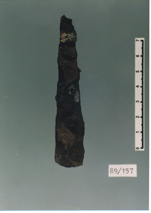 LAMA DI FORMA TRIANGOLARE ALLUNGATA. IL COLTELLO IN ORIGINE DOVEVA ESSEREPROVVISTO DI CODOLO