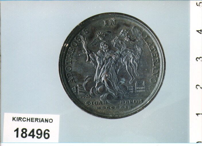 D/ BENED . XIII . P . MAX . A . VI, BUSTO A S. CON CAMAURO E MOZZETTA; SOTTO HAMERANI; R/ APOTHEOSIS IN LATERANO, S. GIOVANNI NEPOMUCENO CORONATO DA UN ANGELO; IN ESERGO S. IOAN NEPOM / MDCCXXIX