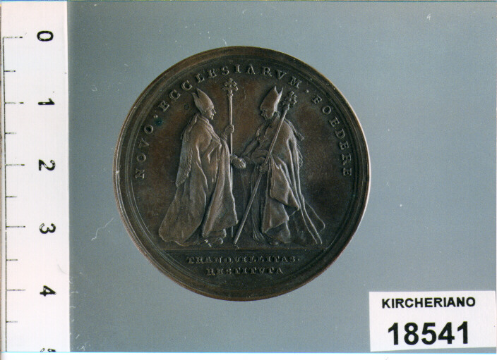 D/ BENED . XIV PONT . MAX . A . XIV ., BUSTO A D. CON CAMAURO, MOZZETTA ESTOLA; SOTTO O . HAMERANI; R/ NOVO . ECCLESIARVM . FOEDERE, DUE VESCOVI SI STRINGONO LA MANO; IN ESERGO TRANQVILLITAS . / RESTITUTA