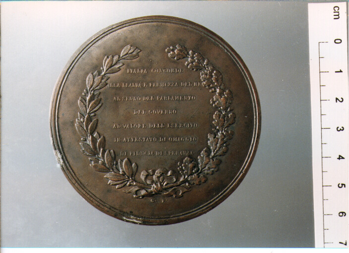 D/ VITTORIO EMANUELE II, IL RE RICEVE LA CORONA; SULLA LINEA DI ESERGO, G.FERRARIS FECE E INV.; IN ESERGO APERTVRA DEL PARLAMENTO 1859; R/ ITALIA CONCORDE/ALLA LEALTA' E FERMEZZA DEL RE/AL SENNO DEL PARLAMENTO/DEL GOVERNO/AL VALORE DELL'ESERCITO....