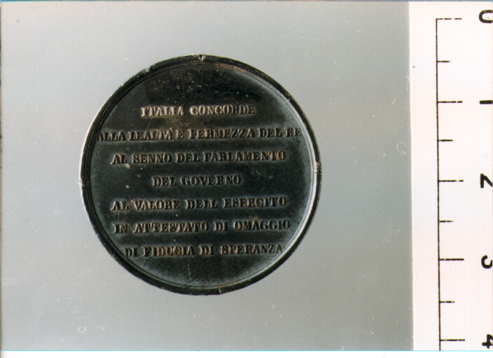 D/VITTORIO EMANUELE II,IL RE RICEVE LA CORONA; NEL CAMPO A S. G.FERRARIS IN ESERGO APERTVRA DEL PARLAMENTO 1859; R/ITALIA CONCORDE/ALLA LEALTA' E FERMEZZA DEL RE/AL SENNO DEL PARLAMENTO/DEL GOVERNO/AL VALORE DELL'ESERCITO/ IN ATTESTATO DI OMAGGIO./.