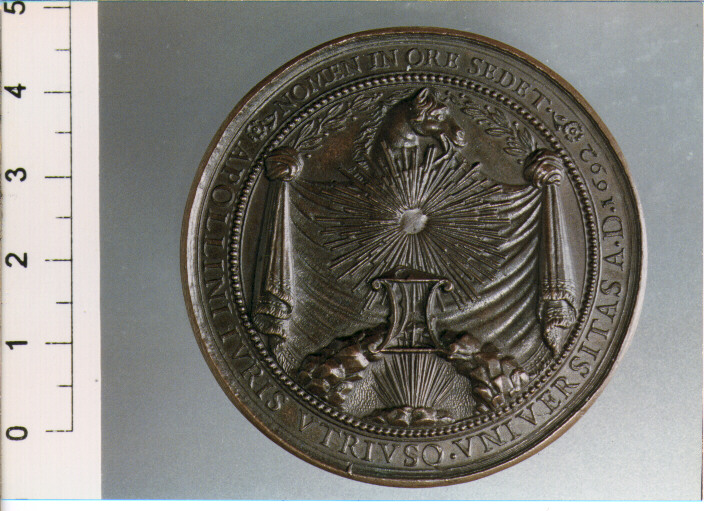 D/ HIPP . ABB . FORNASARIVS BON . ARCHIGY . I . C . DEMANE PR . EM, BUSTOA D.; NEL TAGLIO A. TRAVANVS F., SOTTO AE . AN . 65; R/ APOLLINI IVRIS VTRIVSQ . VNIVERSITAS A . D . 1692; NOMEN IN ORE SEDET, EMBLEMI
