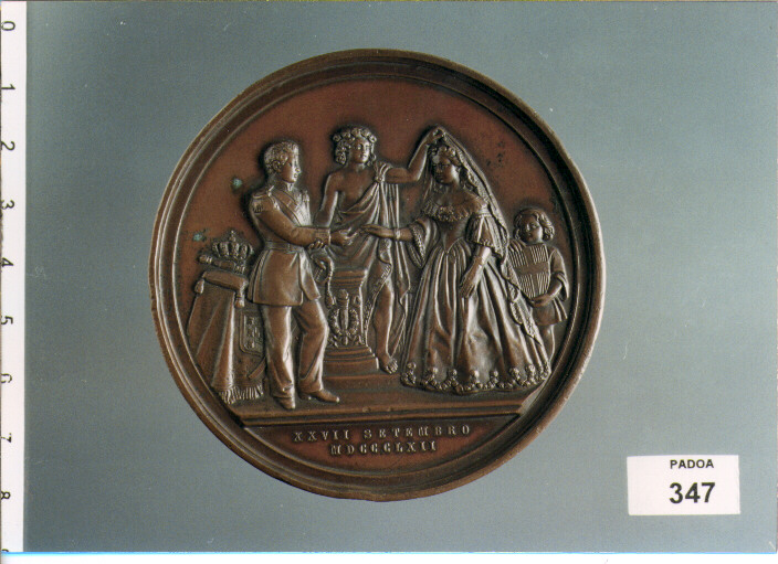 D/ D. LUIZ I REI DE PORTUGAL E DOS ALGARVES D. MARIA DE SABOYA RAINHA DE PORTUGAL E DOS ALGARVES, TESTE ACCOLLATE A S.; SOTTO D. CANZANI; R/ SCENE DI MATRIMONIO; IN ESERGO XXVII SETEMBRO / MDCCCLXII