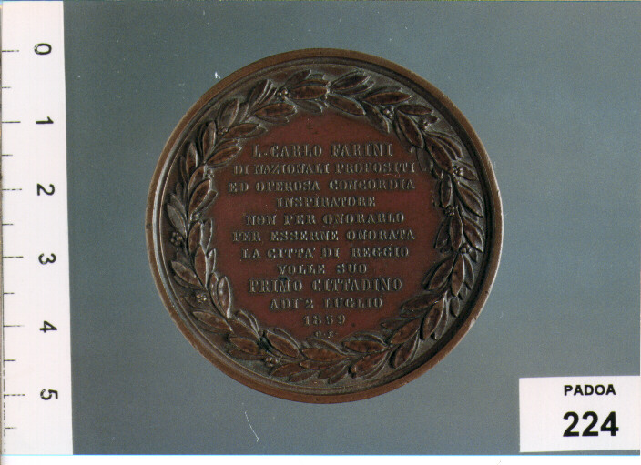 D/ L . CARLO FARINI/ DI NAZIONALI PROPOSITI/ ED OPEROSA CONCORDIA/.../ LACITTA' DI REGGIO/ VOLLE SUO/ PRIMO CITTADINO/ A DI' 2 LUGLIO/ 1859 SOTTO G. E. ENTRO CORONA DI ALLORO; R/ COTANTA EBBERO/ IN LUI/FEDE I REGGIANI/ CHE LE SORTI DELLA PATRIA/..