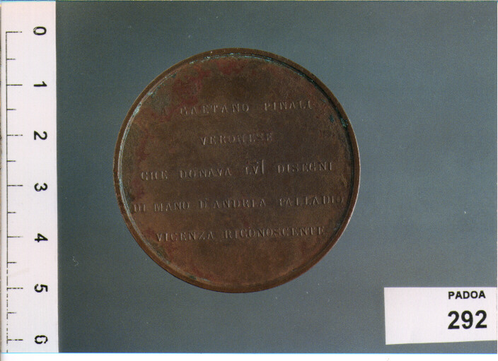 D/ A GAETANO PINALI / VERONESE/ CHE DONAVA LVI DISEGNI/ DI MANO D'ANDREA PALLADIO/ VICENZA RICONOSCENTE; R/ FIGURA FEMMINILE SEDUTA; SOTTO F. PUTINATI; IN ESERGO MDCCCXXXIX