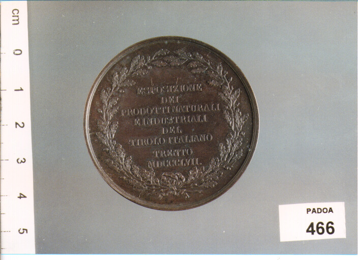 D/ ALLA OPEROSITA' INTELLIGENTE, FIGURA DI TRENTO TURRITA SEDUTA; SOTTO A. FABRIS F.; R/ ESPOSIZIONE/ DEI/ PRODOTTI NATURALI/ E INDUSTRIALI/ DEL/ TIROLO ITALIANO/ TRENTO/ MDCCCLVII ., ENTRO CORONA DI QUERCIA