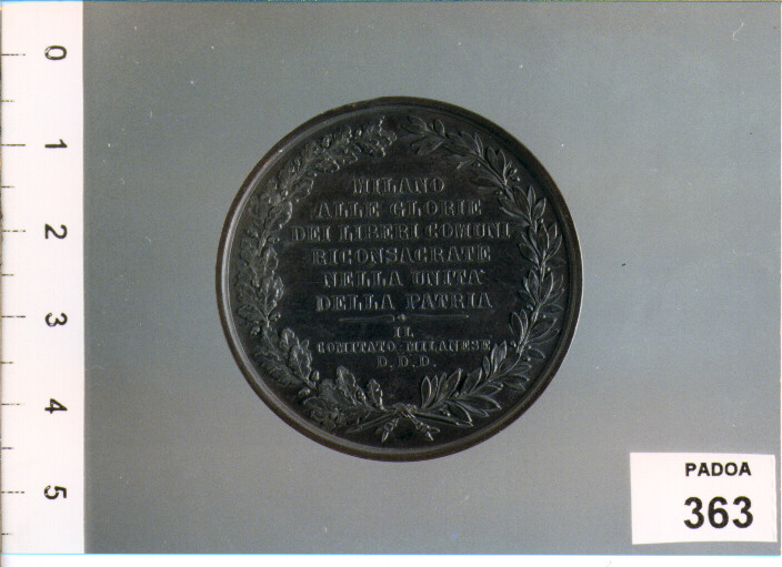 D/ VII CENTENARIO DELLA VITTORIA DI LEGNANO XXIX MAGGIO MDCCCLXXVI CARROCCIO; SOTTO F . BROGGI F.; R/ MILANO/ALLE GLORIE/DEI LIBERI COMUNI/RICONSACRATE/NELLA UNITA'/DELLA PATRIA/IL /COMITATO MILANESE/D.D.D. ENTRO CORONA DI QUERCIA E ALLORO