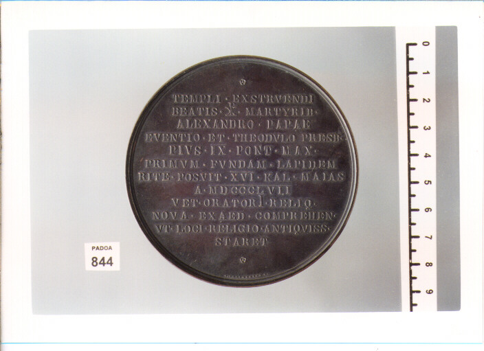 D/ PIVS IX.PONT.MAX., BUSTO A S.; SOTTO NIC.CERBARA F., ENTRO CORONA DI QUERCIA E ALLORO; R/ TEMPLI.EXSTRVENDI/BEATI.XP.MARTYRIB./ALEXANDRO.PAPAE/EVENTIO.ET.THEODVLO.PRESB./PIVS.IX.PONT.MAX./PRIMVM.FVNDAM.LAPIDEM/RITE.POSVIT.XVI.KAL.MAIAS/A.MDCCCLVII