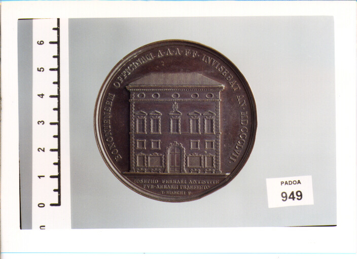 D/ PIVS.IX.PONT.MAX.,BUSTO A D.; R/ BONONIENSEM OFFICINAM A.A.A.F.F.INVISEBAT AN.MDCCCLVII.,EDIFICIO DELLA ZECCA; IN ESERGO,IOSEPHO FERRARI ANTISTITE/PVB.AERARII.PRAEFECTO; SOTTO I.BIANCHI.F.F