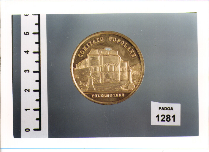 D/ VI CENTENARIO DEL VESPRO, FIGURA FEMMINILE ALLEGORICA SEDUTA CON SPADEE SCUDO DI SICILIA; DIETRO IL MONTE PELLEGRINO; IN ESERGO, JOHNSON R/ COMITATO POPOLARE ; VEDUTA DEL PALAZZO REALE DI PALERMO; IN ESERGO PALERMO 1882