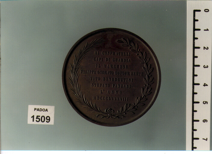 D/ S. SEBASTIANO TRAFITTO; IN ESERGO, PIERONI INC. ; R/ AI CONFRATELLI/ CAPI DI GUARDIA/ IL MARCHESE/ FILIPPO ONORATO DUFOUR BERTE/ TITO BENEDETTINI/ STEFANO PANZANI/ L'ANNO/ MDCCCLXXXVIII, ENTRO CORONA DI PALMA E ALLORO