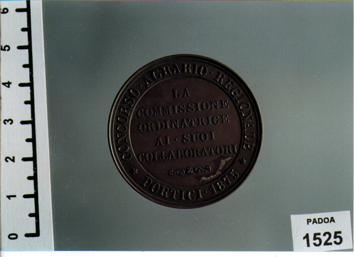 D/ FIGURA FEMMINILE SEDUTA A S. ; IN ESERGO, PIERONI F. FIRENZE; R/ CONCORSO AGRARIO REGIONALE PORTICI. 1875; NEL CAMPO, LA/ COMMISSIONE/ ORDINATRICE/ AI SUOI/ COLLABORATORI