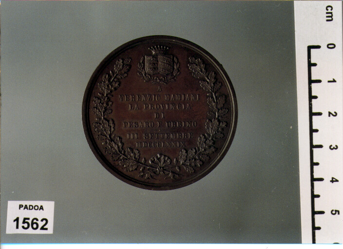 D/ TESTA A S. ; SOTTO, LUIGI GORI FECE IN FIRENZE. TOLTO DAL BUSTO DI V. CONSANI; R/ A/ TERENZIO MAMIANI/ LA PROVINCIA/ DI/ PESARO E URBINO/ III SETTEMBRE/ MDCCCLXXIX, ENTRO CORONA DI QUERCIA