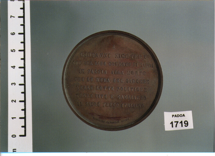 D/ BUSTO A D. ; SOTTO, GIOV. VAGNETTI FECE IN ROMA 1888; R/ A/ GIOVANNI NICOTERA/ CHE SUL LIDO CRUENTO DI SAPRI/ IN FACCIA ALLA MORTE/ FRA LE MURA DEL CARCERE/ NELLE LOTTE POLITICHE/ TENNE VIVO E GAGLIARDO/ IL SACRO FUOCOITALIANO/ ; ..