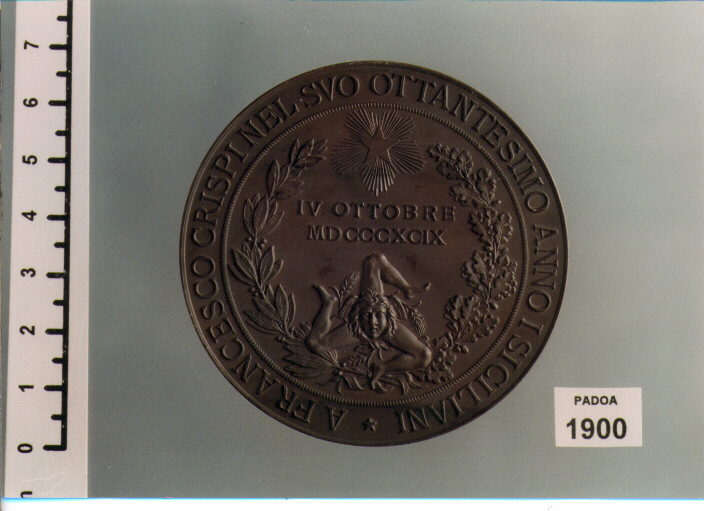 D/ BUSTO DI TRE QUARTI A D. ; SOTTO, A. FARNESI F. ; R/ A FRANCESCO CRISPI NEL SVO OTTANTESIMO ANNO I SICILIANI; NEL CAMPO, IV OTTOBRE/ MDCCCXCIX; SOPRA, STELLA RADIATA; SOTTO, LA TRINACRIA ENTRO CORONA DI QUERCIA E ALLORO