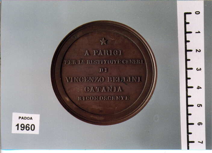 D/ A VINCENZO BELLINI CREATORE D' ITALICHE MELODIE. CATANIA MDCCCLXXVI, TESTA A S. ; SOTTO, F. SPERANZA; R/ A PARIGI/ PER LE RESTITUITE CENERI/ DI/VINCENZO BELLINI/ CATANIA/ RICONOSCENTE