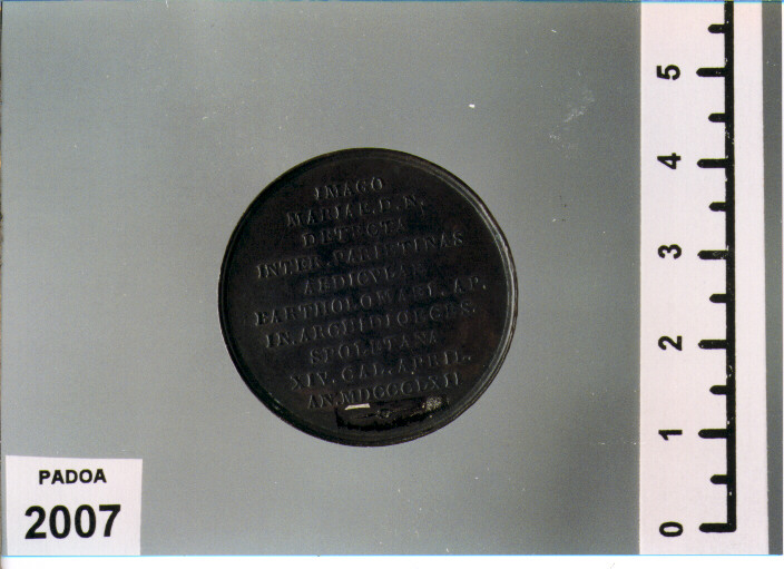 D/ AVXILIVM CHRISTIANOR. , LA MADONNA SEDUTA COL BAMBINO; SOTTO, F. SPERANZA F. ; R/ IMAGO/ MARIAE. D. N. / DETECTA/ INTER. PARIETINAS/ AEDICVLAE/ BARTHOLOMAEI. AP. / IN. ARCHIDIOCES. / SPOLETANA/ XIV. CAL. APRIL. / AN. MDCCCLXII