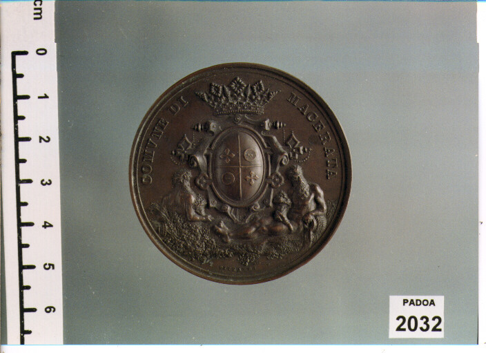 D/ COMUNE DI MACERATA, STEMMA DEL COMUNE; SOTTO, L. BIZZARRI; R/ A/ LAVROROSSI/ MACERATESE/ DI/ MELODIE DIVINE/ MAESTRO/ LA/ PATRIA SVPERBA/ 1875,ENTRO CORONA DI ALLORO
