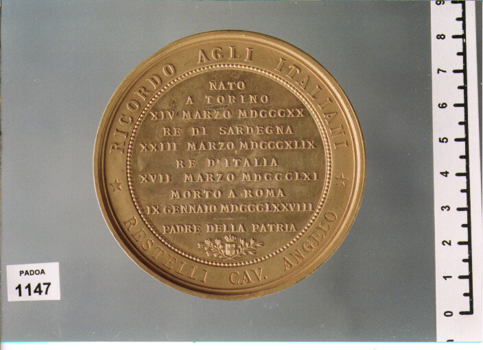 D/ VITTORIO EMANUELE II., TESTA A S.;SOTTO,A. RESTELLI INC. /TORINO; R/ RICORDO AGLI ITALIANI RESTELLI CAV. ANGELO; NEL CAMPO, NATO/ A TORINO/ XIV MARZO MDCCCXX/RE DI SARDEGNA/XXIII MARZO MDCCCXLIX/RE D' ITALIA/ XVII MARZO MDCCCLXI/ .../ MDCCCLXXVIII