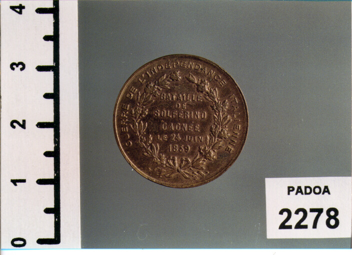 D/ VICTOR EMMANUEL ROI D' ITALIE, TESTA A D. ; SOTTO, C. T; R/ GUERRE DE L' INDEPENDANCE ITALIENNE; NEL CAMPO, BATAILLE/ DE/ SOLFERINO/ GAGNEE/ LE 24 JUIN/ 1859, ENTRO CORONA DI QUERCIA E ALLORO