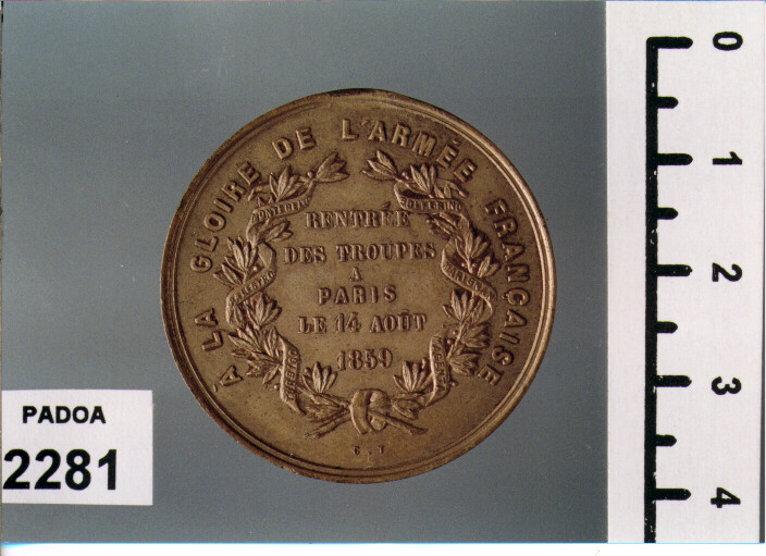D/ NAPOLEON III EMPEREUR, TESTA A S. ; SOTTO, C T; R/ A' LA GLOIRE DE L' ARMEE FRANCAISE; NEL CAMPO, RENTREE/ DES TROUPES/ A/ PARIS/ LE 14 AOUT/ 1859, ENTRO CORONA DI ALLORO; SOTTO, C. T