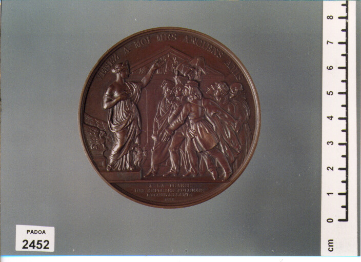 D/ LOUIS PHILIPPE I ROI DES FRANCAIS, TESTA LAUREATA A S. ; SOTTO, WL. OLESZOZYNSKI. F. ; R/ VENEZ A MOI MES ANCIENS AMIS, LA FRANCIA STANTE CHIAMAA SE' I RIFUGIATI POLACCHI; IN ESERGO, A LA FRANCE/ DES REFUGIES POLONAIS/ RECONNAISSANTS/ 1838