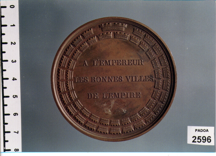 D/ A L' EMPEREUR/ LES BONNES VILLES/ DE L' EMPIRE, ENTRO DUE GIRI DI CORONE TURRITE CON DENTRO NOMI DELLE CITTA' DI FRANCIA; R/ L' IMPERATORE ALZA IL NEONATO PRESSO IL FONTE BATTESIMALE;SOTTO, ANDRIEU FECIT.;IN ESERGO,BAPTEME DU ROI DE ROME/ M.DCCCXI