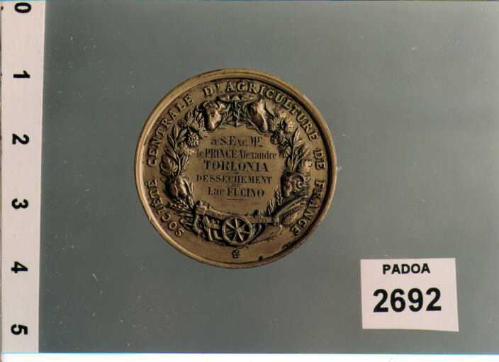 D/ OLIVIER DE SERRES N. EN 1539, M. 2 J.T 1619, BUSTO A D. ; SOTTO, DROZ F. / M. DCCCVII; R/ SOCIETE' CENTRALE D' AGRICULTURE DE FRANCE,NEL CAMPO, A' S. EXC. MR/LE PRINCE ALEXANDRE/TORLONIA/ DESSECHEMENT/ DU/ LAC FUCINO, ENTRO ORNATO DI VARI ELEMENTI